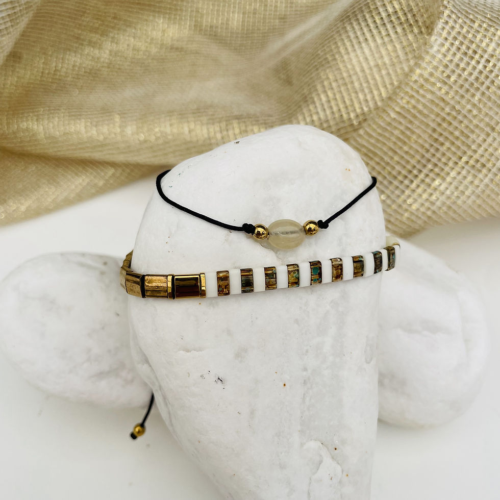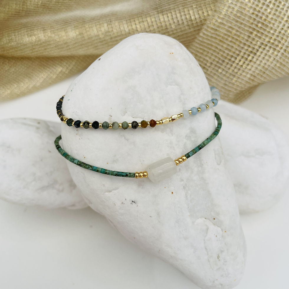 Yeşil Buz Mavisi Bebe Boncuk Beyaz Silindir Gold Süslemeli 2li Kombin Bileklik